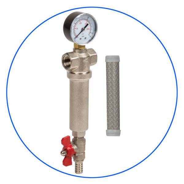 Αυτοκαθαριζόμενο φίλτρο για κρύο και ζεστό νερό. Διαθέτει κρουνό εκκένωσης των σωματιδίων και μανόμετρο ένδειξης της πίεσης εισόδου.