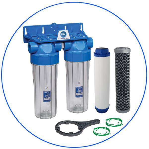 Aqua Filter Home Solution FCCBKDF2. Αποτελείται από μια διπλή φιλτροθήκη η οποία τοποθετείται κάτω από τον πάγκο της κουζίνας και καταλαμβάνει μικρό όγκο, περιλαμβάνει: