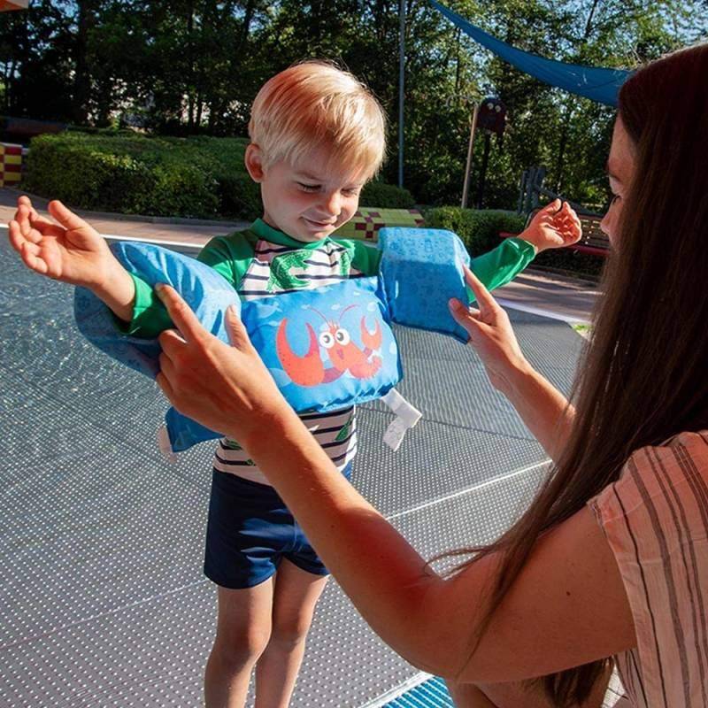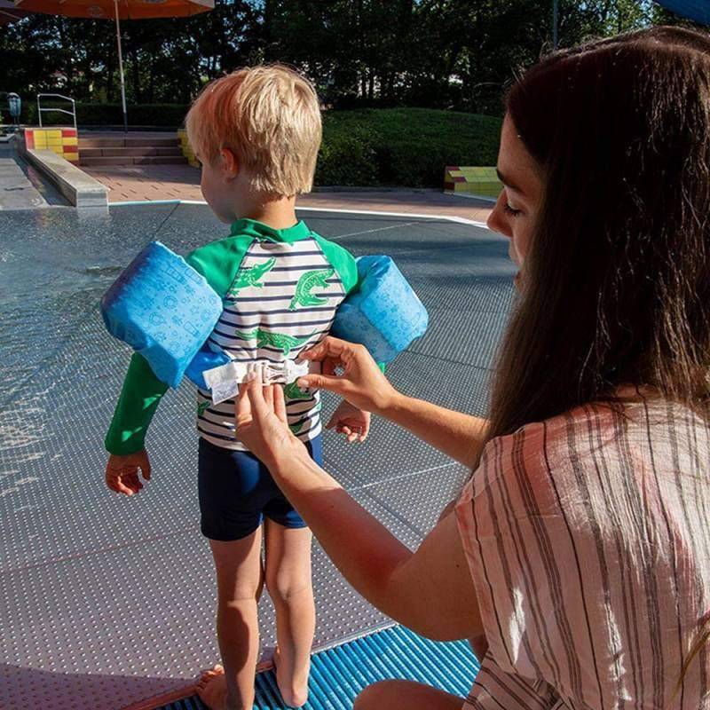 The swim vest ties at the back of the back with the safety buckle and the adjustable strap helps to ensure a perfect fit on your child's body, thus providing you with the necessary safety but also freedom of movement. The safety strap prevents the vest from slipping during use and prevents children from removing the vest without parental help.