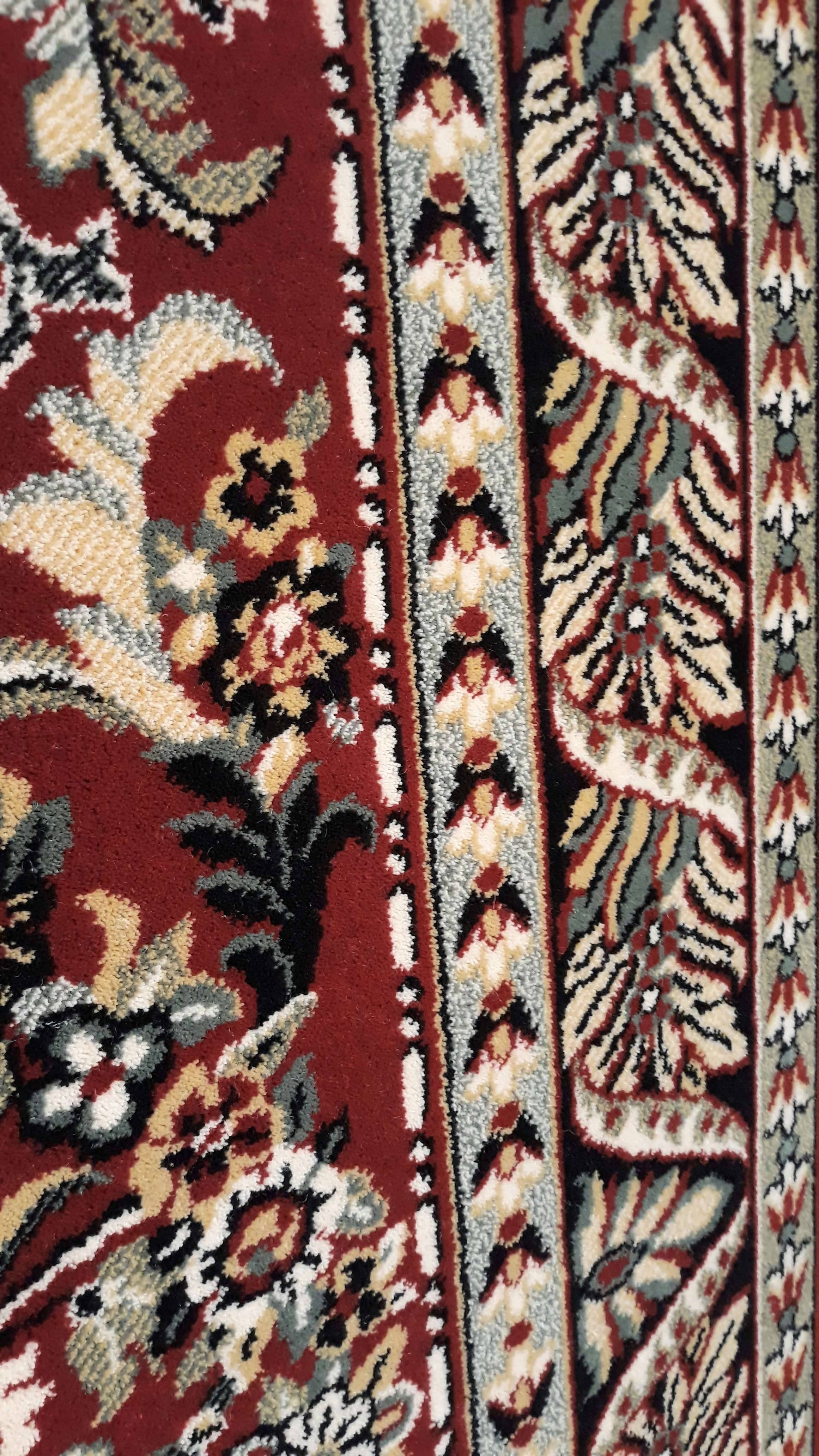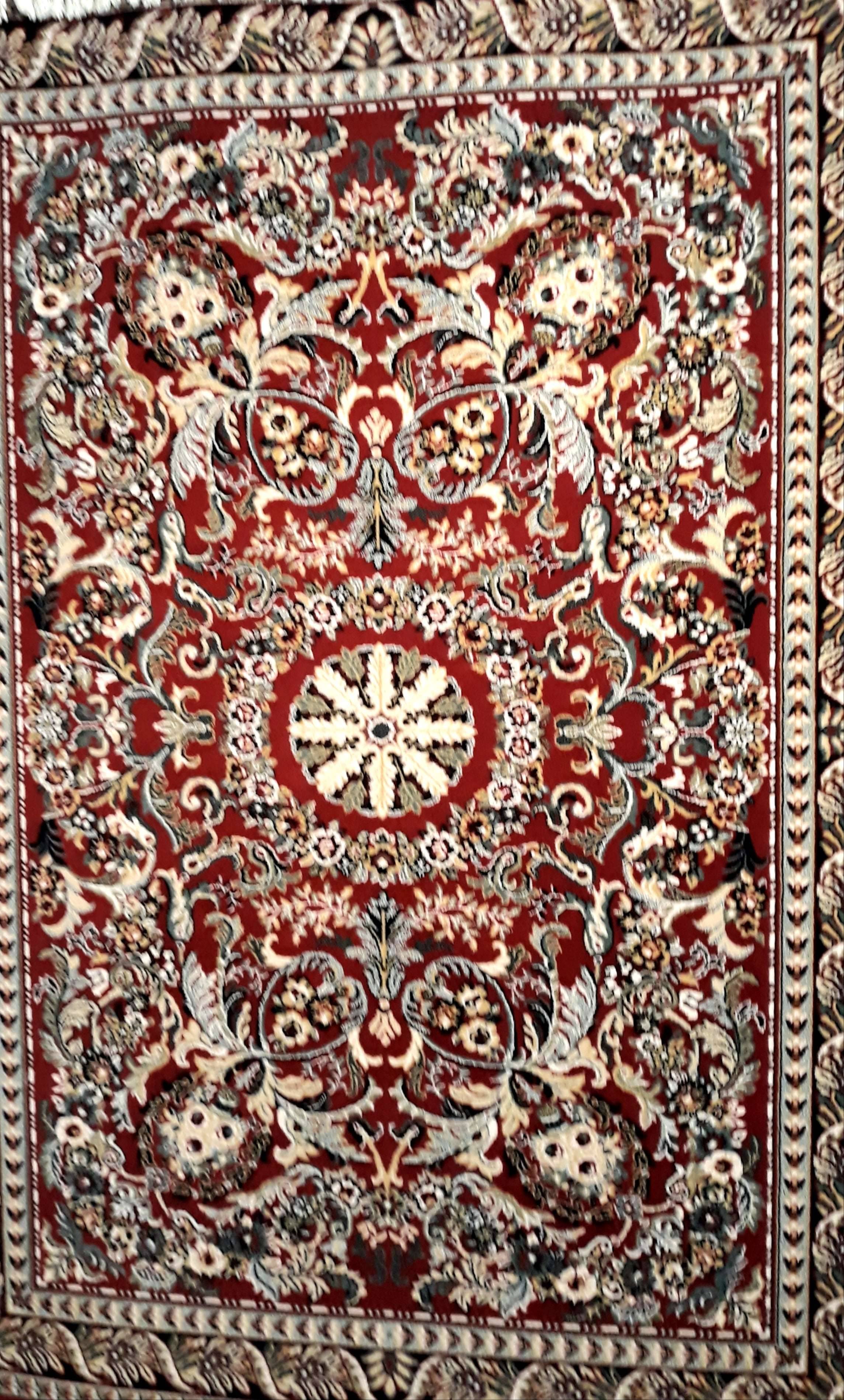 Knossos all-wool carpet from Biocarpet. In dimension 170X240 suitable for any living room or sitting room, with fantastic designs and colors on a deep burgundy background. Its fringe is beige in order not to stain.