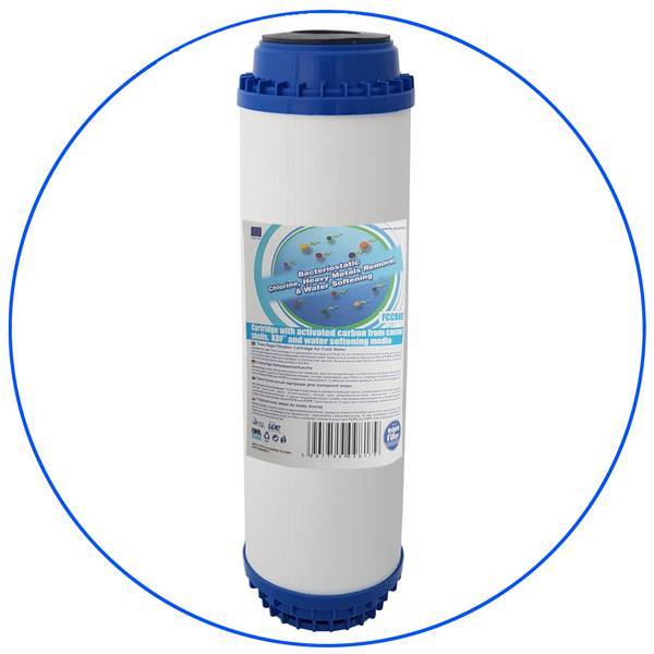 Provides three-stage filtration. It is made of activated carbon coconut shell and contains K, D, F, and resin. Fits 10'' filter holders. It is suitable for filtering cold drinking water and should not be used in water that is contaminated or of unknown origin. 1st Filtration Stage: KDF material removes hydrogen sulphide, pesticides, iron and reduces the content of heavy metals lead, arsenic, cadmium, mercury. In addition, KDF has bacteriostatic properties and prevents the growth of bacteria. 2nd Filtration Stage: The resin is responsible for softening the water through the ion exchange method (a chemical process of exchanging magnesium and calcium ions with sodium ions where the hardness of the water is removed) 3rd Stage Filtration: Coconut shell activated carbon improves the smell and taste of water after removing chlorine, pesticides, aromatic hydrocarbons, benzene phenol and other chemical compounds. Features: 3-stage water filtrationReduction of the content of iron and heavy metals lead, arsenic, cadmium, mercury. Water softening through the ion exchange method. Hydrogen sulfide removal. Pesticide removal. Benzene and phenol removal. 99% chlorine removal. Biological removal of chemical compounds. Improves the smell and taste of water. 10″Operating Temperature: 2°C – 45°C