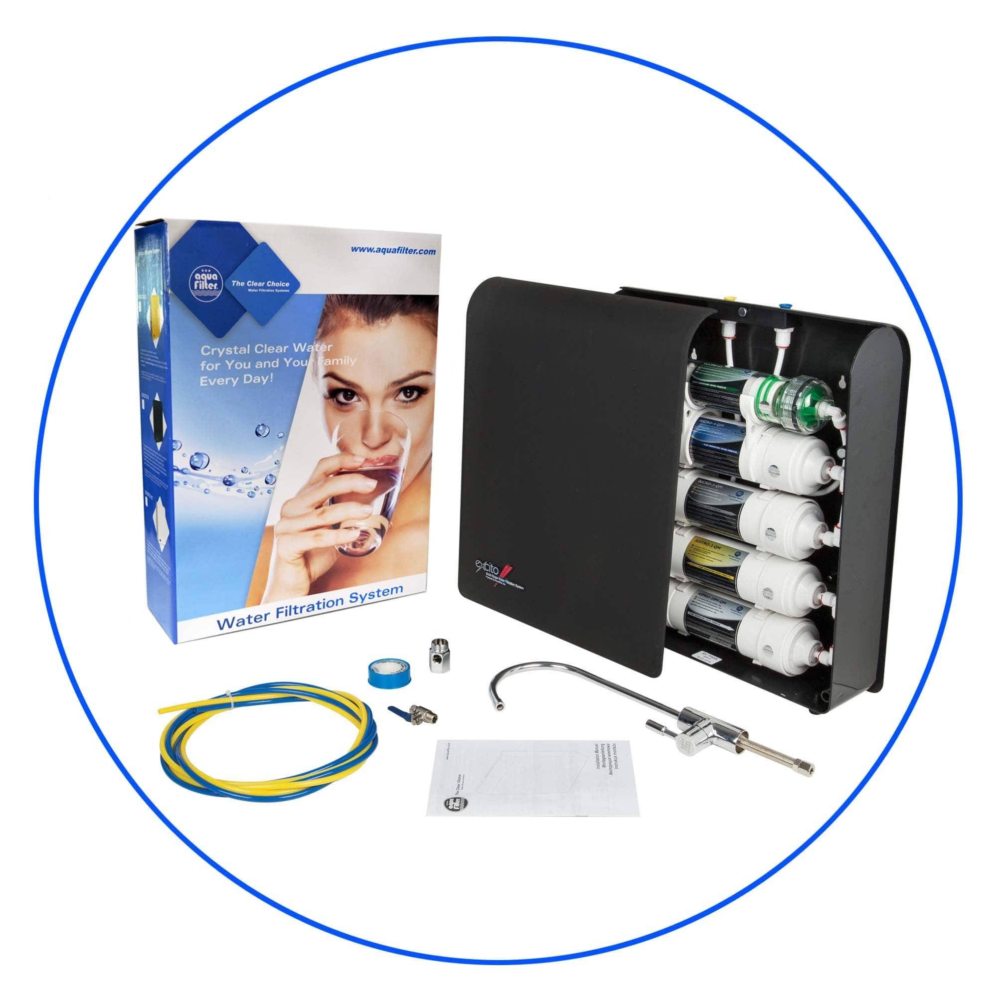 Aqua Filter Company's Excito-B is a powerful under-counter, seven-stage filtration system. It uses 2.5″ x 11″ (standard global market size) easy-to-replace inline filters, which are enclosed in a highly aesthetic and compact box so that it does not take up much space under the kitchen counter. Excito-B works purposefully to remove a multitude of contaminants from tap water without affecting the beneficial elements of the water. Manufactured in the EU Excito's seven filtration stages: First stage: Solid Particle Filter, which removes dirt, rust, suspended particles from tap water Second and Third Stage: Softening and Ironing Combo Filter, which reduces water hardness and removes iron using resin Fourth stage: Carbon Block Carbon Filter from coco palm, which reduces most of the chlorine, organic and chemical pollutants while removing unpleasant odor and taste from tap water Fifth and Sixth stage: Carbon Block Carbon Filter + KDF for the final dechlorination of water while the KDF material reduces the percentage of a series of heavy metals such as cadmium, arsenic, lead, mercury etc. Seventh stage: Ultra filtration membrane 0.02 micron Made in Germany, which offers protection against bacteria, parasites and cysts while removing micro particles up to 0.02 micron The first six filtration stages are available as spare parts in a special package the (replacement every six months) The seventh stage of the 0.02 micron membrane is replaced every year. The System includes all the components needed for its installation (water thief 1/2″ with 1/4″ switch, 6mm connection tube, Deluxe countertop faucet, Teflon tape, canister key, etc.) Technical Characteristics : Dimensions (H x W x D): 438 x 100 x 360 (mm) Connection Adapter: 1/2″ Operating Temp.: 2 °C- 45 °C (113ºF 35ºF) Operating Pressure: 4 bar (58 psi) Certified from: